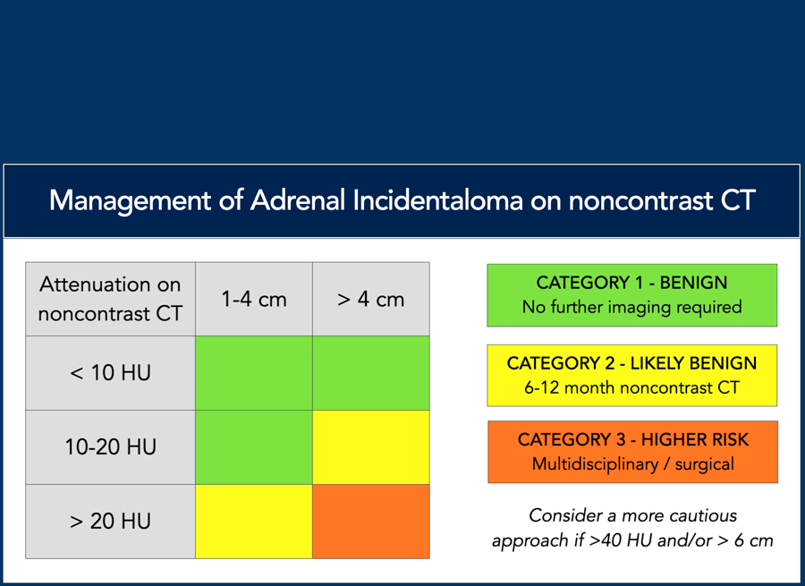 - Benign: < 10HU (any size) or 10-20HU (1-4 cm). No further imaging is needed.