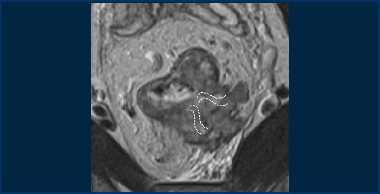 - T2-weighted MRI: Tumor barely recognizable due to fecal obscuration.