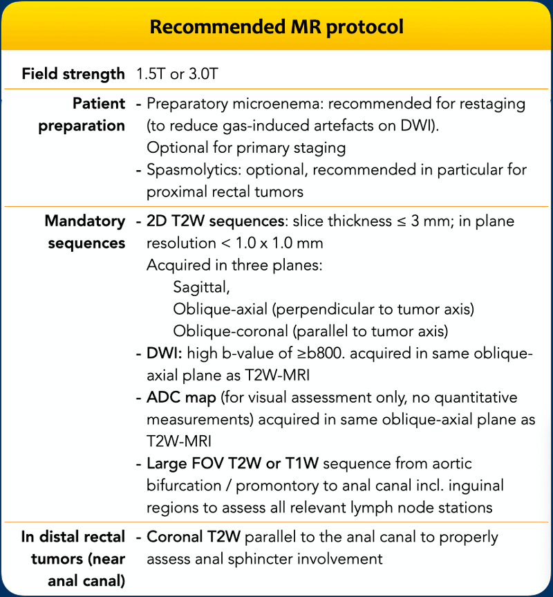 - Purpose: Accurate assessment of tumor extension beyond the rectal wall and distance to the MRF