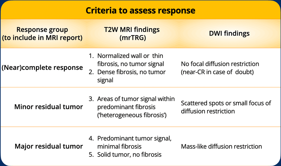In patients receiving neoadjuvant therapy, MRI—together with endoscopy—is pivotal for evaluating treatment response. It distinguishes between: