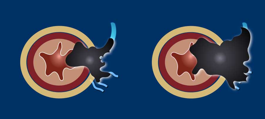 - Polypoid: Raised on a stalk or focal attachment, often low-grade (T1–T2), projecting into the lumen.