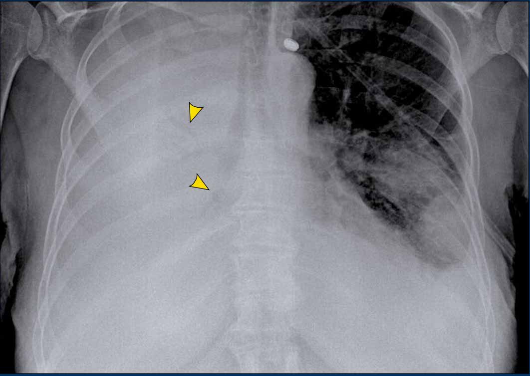• The most striking finding on the chest X-ray is the presence of free intraperitoneal air beneath the diaphragm, indicative of bowel perforation.