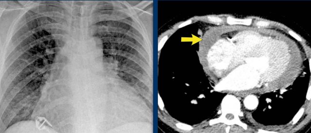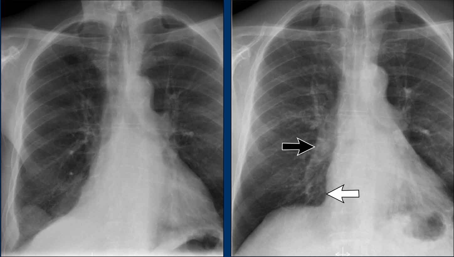 This appearance can mimic right middle lobe consolidation or atelectasis due to loss of the normal silhouette (silhouette sign).
