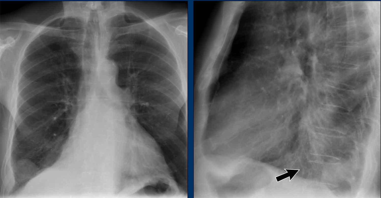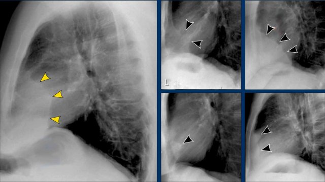 • Any opacity in the region of the vertebral bodies should prompt correlation with the PA view to assess for spondylotic osteophytes, which are typically located on the right side.