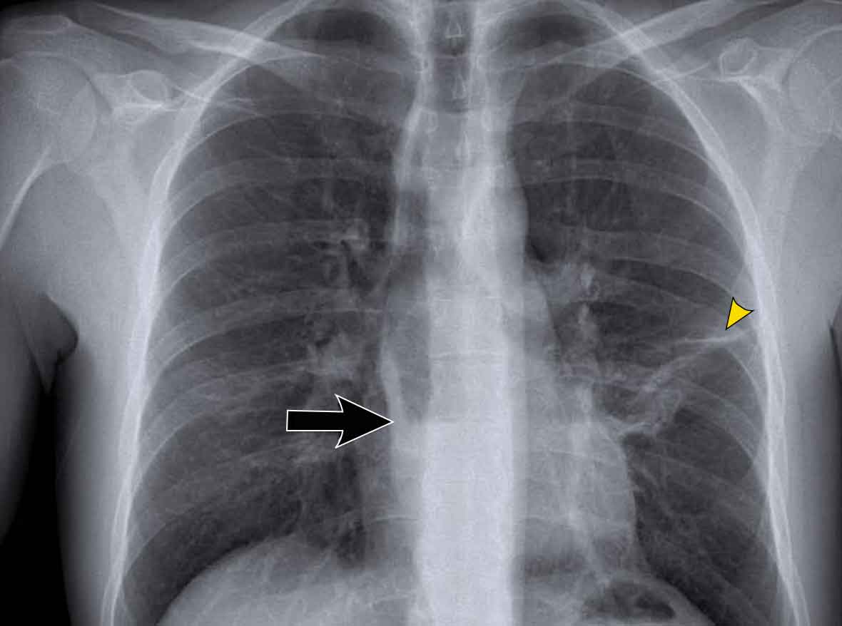 • Widening of the right paratracheal stripe (>2–3 mm) may indicate lymphadenopathy, pleural thickening, hemorrhage, fluid overload, or congestive heart failure.