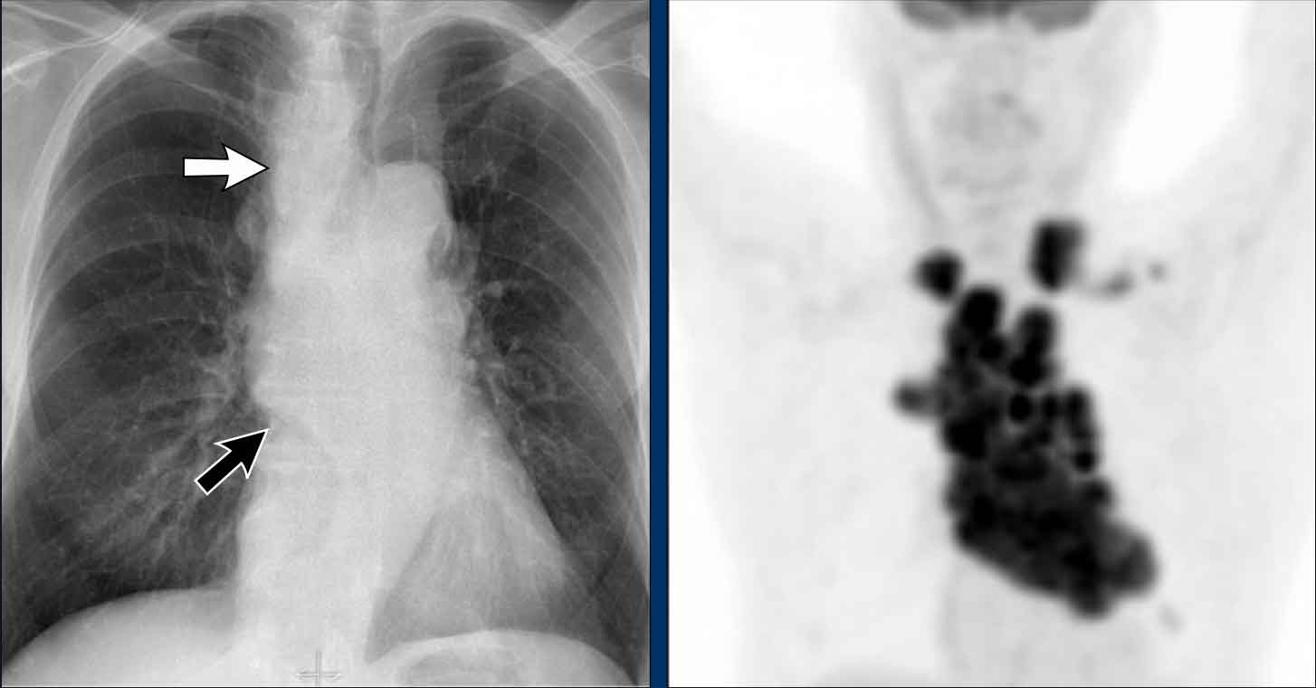Any radiopacity within the upper retrosternal space is suspicious for a lesion in the anterior mediastinum or a mass arising from the upper lobes of the lungs.