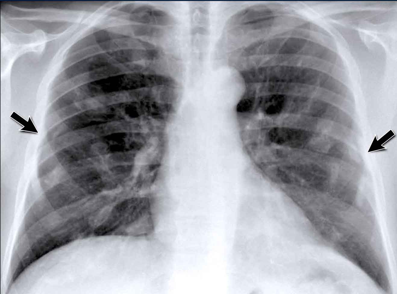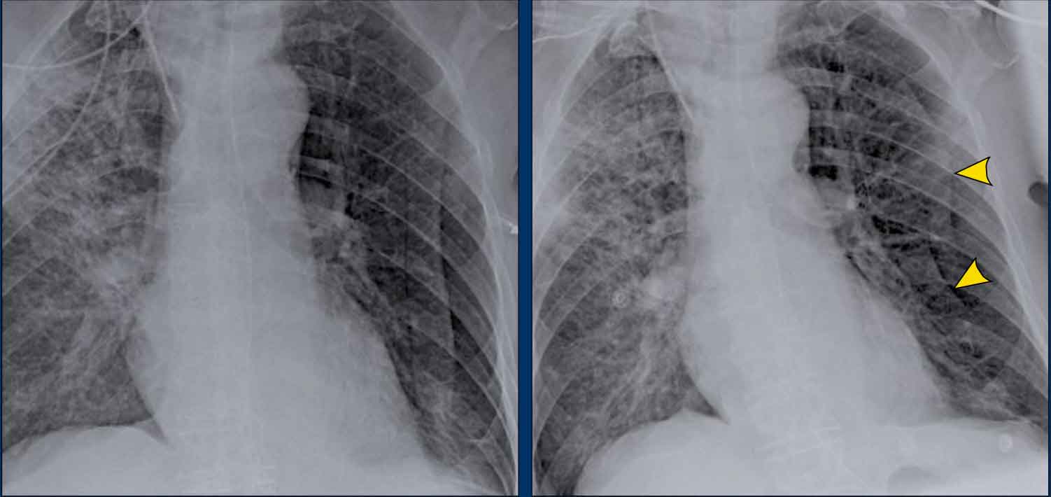 • Chest X-ray shows a retracted visceral pleura (blue arrow), consistent with pneumothorax.