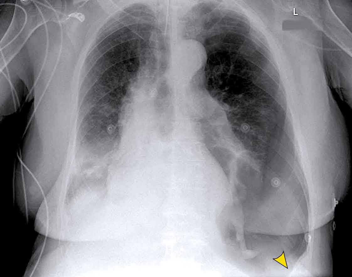 • Air-fluid level (hydropneumothorax) (black arrow)