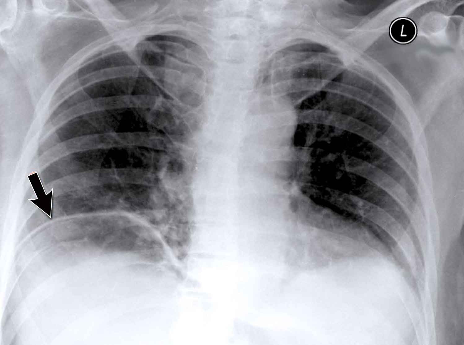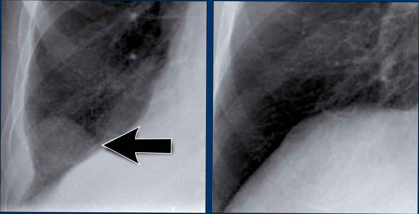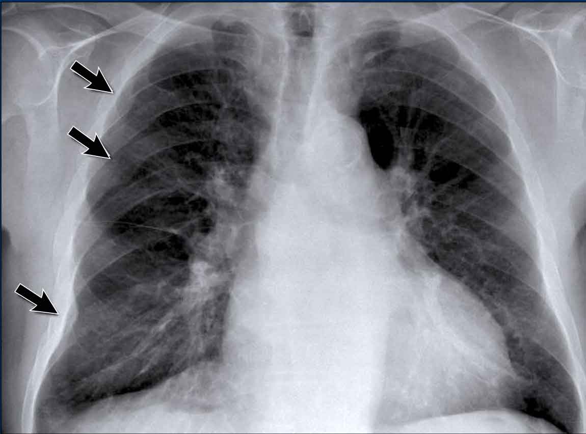 • A thin, well-defined diaphragmatic contour is visible (arrow), differentiating it from plate-like atelectasis, which may mimic this appearance in cases of suboptimal inspiration.