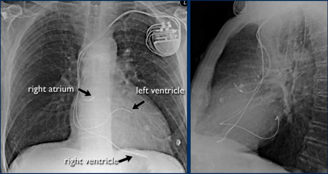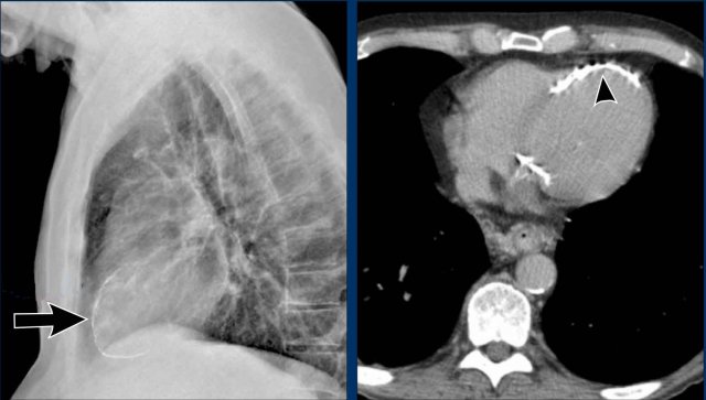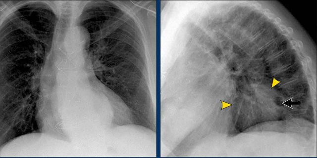 The retrosternal space normally contains aerated lung and should therefore appear radiolucent (dark on the radiograph), extending inferiorly to the level where the right ventricle contacts the sternum (small black arrow).