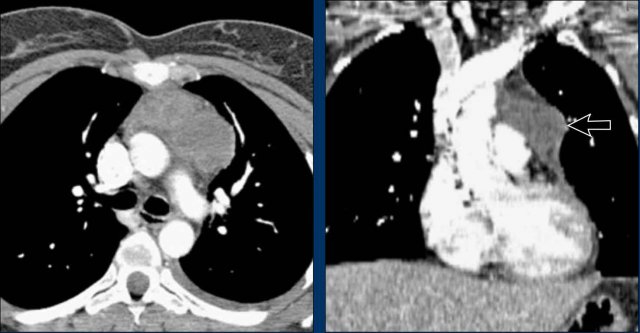 • It is located anteriorly, often presenting as a right-sided retrosternal mass.