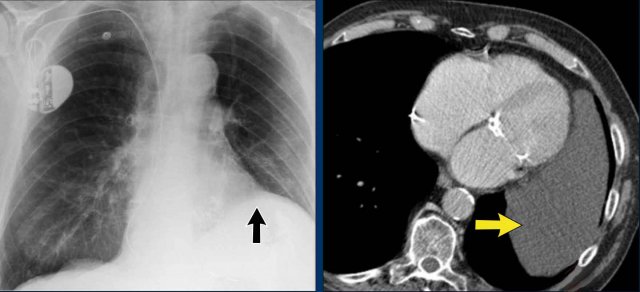 • A Bochdalek hernia is a common incidental finding in adults and results from a posterior diaphragmatic defect(arrows).